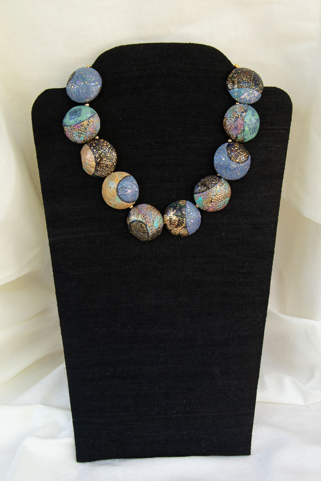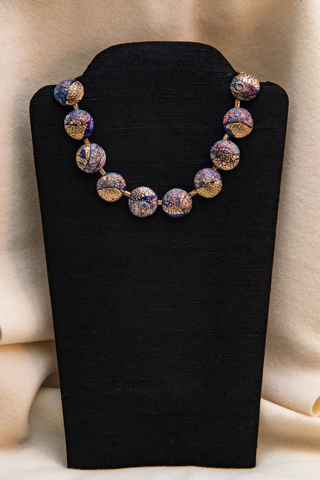 Blue Discs polymer clay, acrylic paint & gold leaf. $65